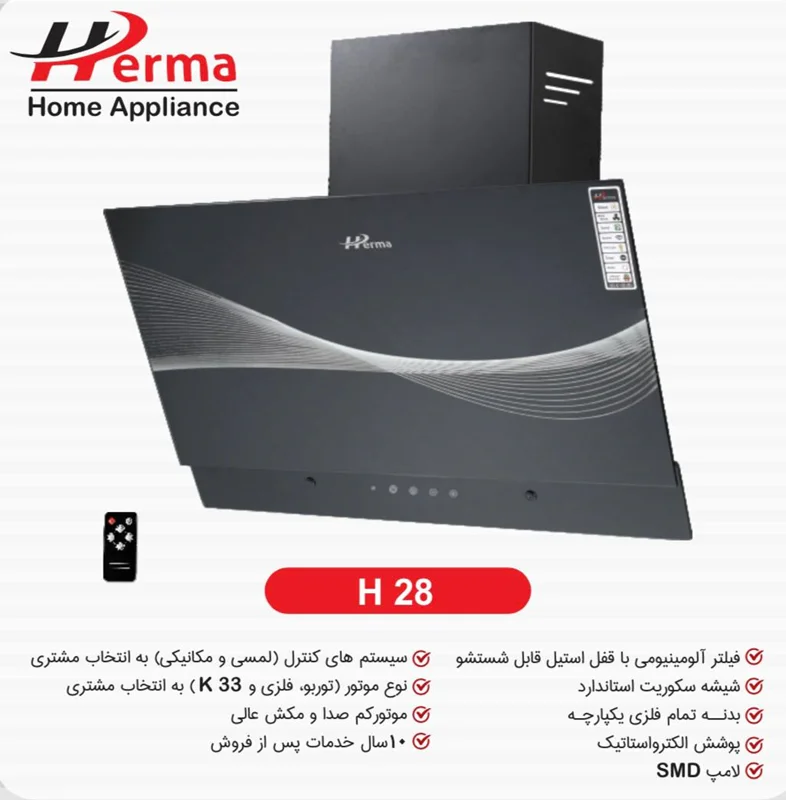 مشخصات ، خرید و قیمت هود هرما مدل تک شیشه دو گوشه